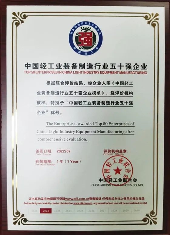 中國輕工裝備制造行業(yè)強企排行評價榜單始于2017年,是中國輕工業(yè)聯(lián)合會貫徹國家加強科技創(chuàng)新、培育具有全球競爭力一流企業(yè),建設(shè)制造強國系列戰(zhàn)略部署的重要舉措。中國輕工業(yè)聯(lián)合會對企業(yè)的營業(yè)收入、利潤總額、主營業(yè)務(wù)收入利潤率、主營業(yè)務(wù)收入增速、研發(fā)投入、專利數(shù)量、自主品牌建設(shè)、主要客戶群體八項指標綜合評分,按統(tǒng)一標準體系進行評價。排行評價榜單實行動態(tài)管理,每年發(fā)布一次,科學(xué)公正,權(quán)威性高,充分展現(xiàn)企業(yè)綜合實力、品牌價值。中輕長泰在輕工行業(yè)深耕23年,一直致力于為客戶提供整體解決方案,致力于輕工行業(yè)“五基”先進基礎(chǔ)工藝綠色研究,走“專特優(yōu)精”發(fā)展道路,引領(lǐng)行業(yè)發(fā)展。