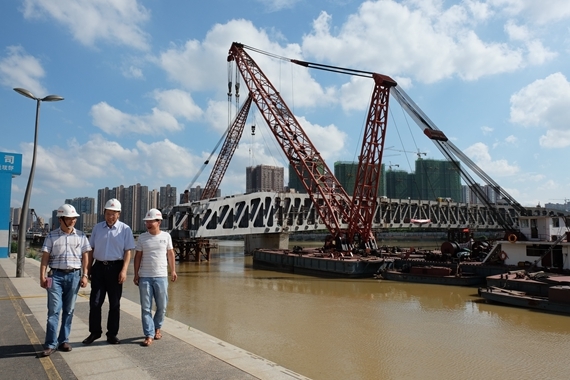 同一時(shí)間,瀏陽河人行景觀橋項(xiàng)目部已經(jīng)完成了最后一艘浮吊平臺(tái)的錨固工作。最初臨時(shí)橋墩施工方案為每組8根鋼管樁,監(jiān)理部審核認(rèn)為該方案未考慮最不利的極端天氣下洪峰的影響,嚴(yán)令改正。最終方案改為14根鋼管樁并予以實(shí)施。正是監(jiān)理人富于遠(yuǎn)見的及時(shí)調(diào)整,在兩日后瀏陽河水位達(dá)40.00米的洪峰里,建設(shè)中的大橋巍然屹立,風(fēng)雨不動(dòng)!