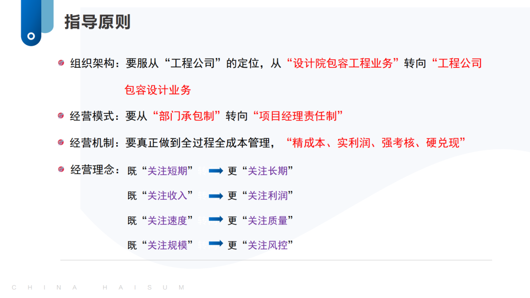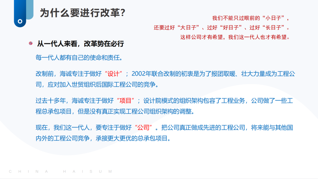 二是要進(jìn)一步提高認(rèn)識(shí),上下一心形成改革合力和發(fā)展動(dòng)力。各級(jí)領(lǐng)導(dǎo)干部要進(jìn)一步提高認(rèn)識(shí),統(tǒng)一思想,融入改革,按照新的組織體系,凝心聚力推進(jìn)公司生產(chǎn)經(jīng)營(yíng)工作。海誠(chéng)總部要著力抓好統(tǒng)一管理和技術(shù)標(biāo)準(zhǔn)、搭建業(yè)務(wù)支持平臺(tái)、協(xié)調(diào)配置內(nèi)外部資源、優(yōu)化完善考核分配機(jī)制等平臺(tái)性基礎(chǔ)性工作。各子公司、各業(yè)務(wù)單位要進(jìn)一步提高站位,樹(shù)立一盤(pán)棋思想,積極支持參與配合海誠(chéng)總部平臺(tái)建設(shè),主動(dòng)承載落實(shí)海誠(chéng)股份總體戰(zhàn)略。