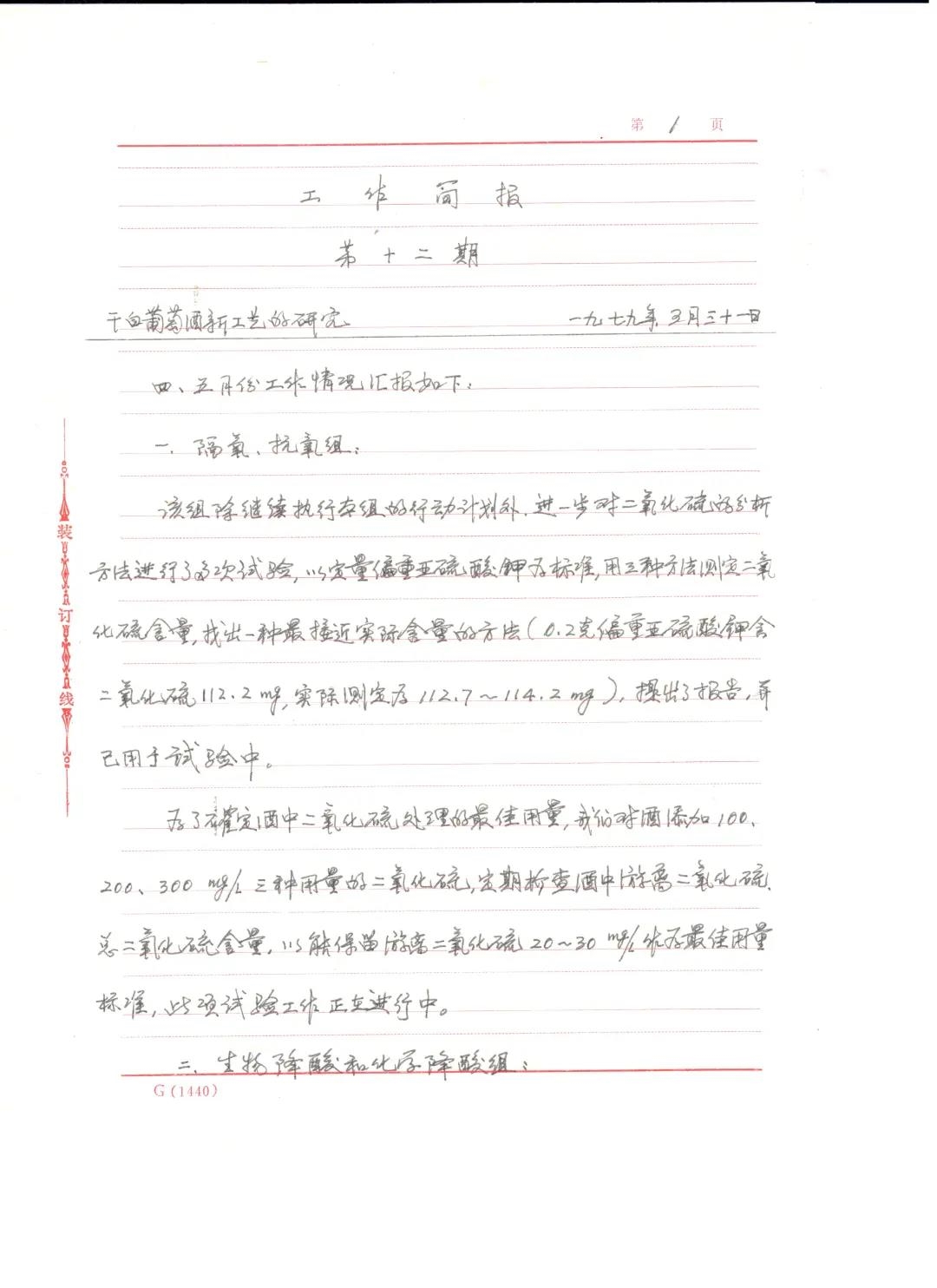 歷史留痕于檔案之上,歲月凝固于檔案之中。在保利中輕中國食品發(fā)酵工業(yè)研究院的檔案管理室,收藏著眾多泛黃的檔案。其中,26期由中國葡萄酒泰斗——郭其昌教授親筆記錄的簡報尤為珍貴。翻開這一頁頁泛黃的紙張,我們循著歷史的痕跡,揭開了新中國第一瓶干白的誕生記憶。