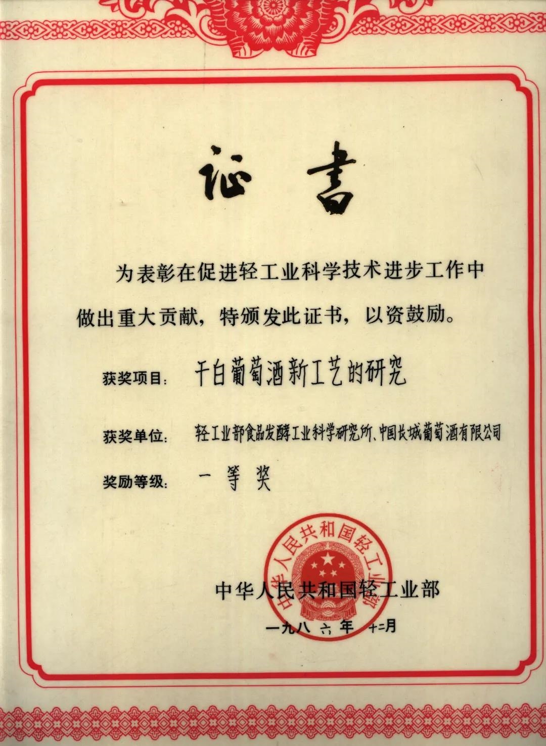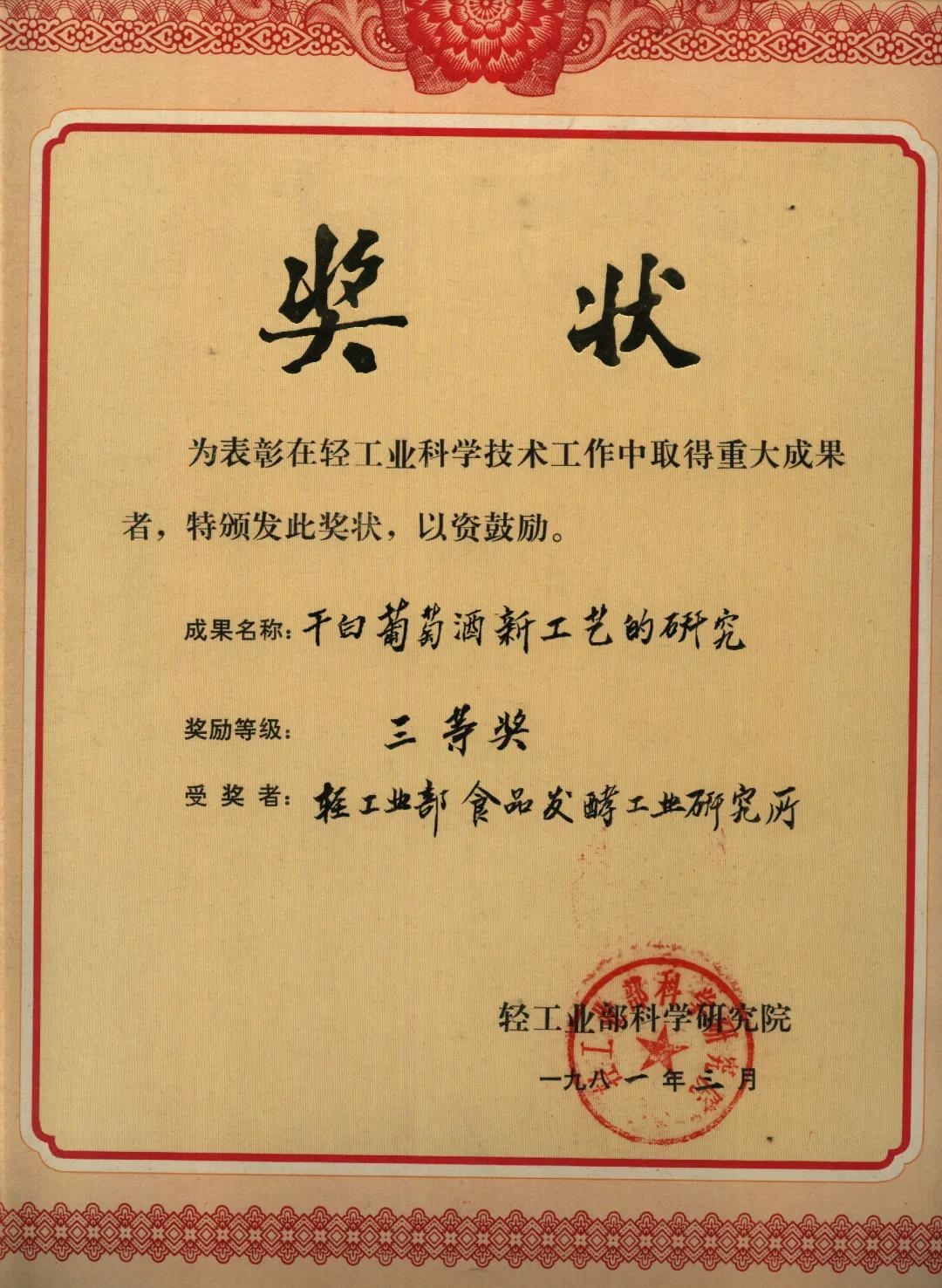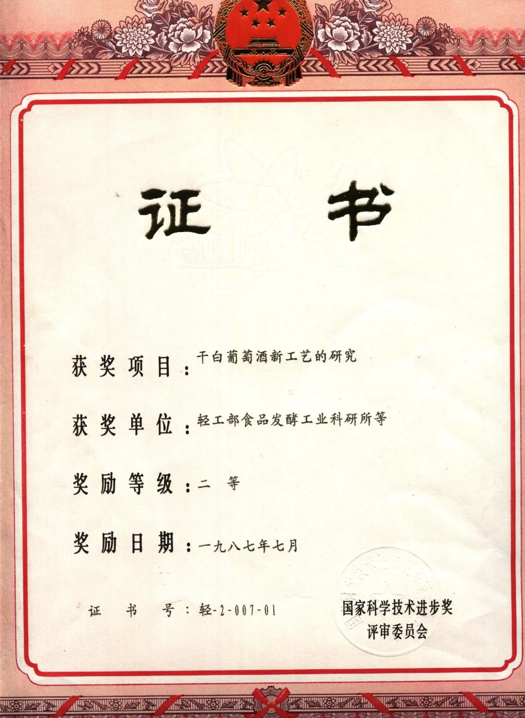 1979年,該葡萄酒獲得國家第三屆評酒會金獎和國家質(zhì)量金獎;1983年在英國倫敦國際第14屆評酒會獲國際銀獎,這是70余年來我國酒類在國際上首次獲獎。該項目198312月通過原輕工部科技局組織的技術(shù)鑒定,成果達到國際先進水平,1987年榮獲國家科技進步二等獎。中國第一瓶干白的研制成功,不僅為國家培養(yǎng)了大批的專業(yè)技術(shù)人才,也為我國葡萄酒工業(yè)的發(fā)展壯大奠定了良好的基礎(chǔ)。