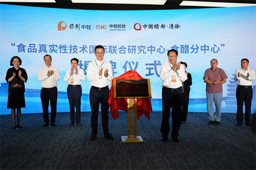 在與會(huì)領(lǐng)導(dǎo)和嘉賓共同見(jiàn)證下,太原市人大常委會(huì)副主任、清徐縣委書(shū)記王劍峰與中輕檢驗(yàn)總經(jīng)理趙紅峰共同為“食品真實(shí)性(FA)技術(shù)國(guó)際聯(lián)合研究中心——食醋分中心”揭牌。