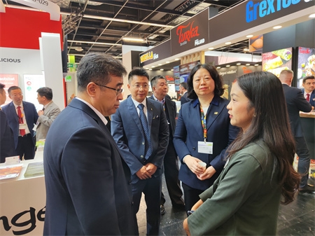 展臺(tái)首日即吸引了來(lái)自歐亞等產(chǎn)業(yè)鏈上下游參展企業(yè)和觀眾的持續(xù)關(guān)注。保利集團(tuán)總經(jīng)理助理,保利中輕黨委書記、董事長(zhǎng)安勝杰來(lái)到中國(guó)食品發(fā)酵工業(yè)研究院展臺(tái),親切慰問參展員工,并前往安琪酵母、加拿大Saputo乳業(yè)公司、法國(guó)SILL SAS集團(tuán)、荷蘭Salud Foodgroup Europe BV等相關(guān)展臺(tái)進(jìn)行交流,與世界食品博覽會(huì)(Anuga)主辦方就未來(lái)有關(guān)合作進(jìn)行交流,并接受主辦方專題采訪。