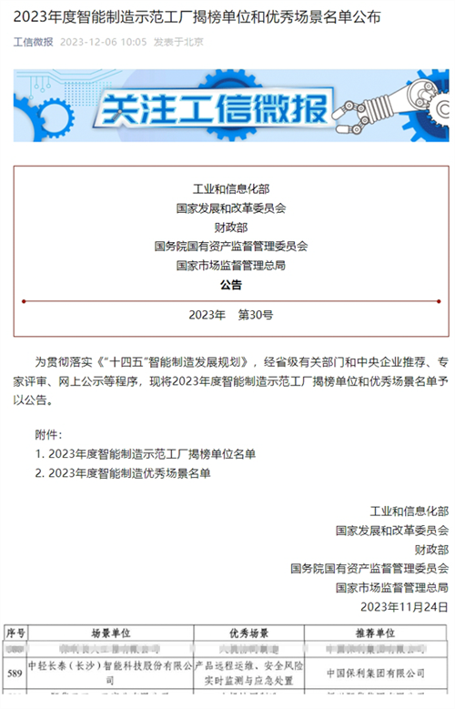 近日,工業(yè)和信息化部公布“2023年度智能制造示范工廠揭榜單位和優(yōu)秀場景名單”。保利中輕所屬中輕長泰研發(fā)的“產(chǎn)品遠程運維”和“安全風險實時監(jiān)測與應急處置”成功入選智能制造優(yōu)秀場景名單,凸顯中輕長泰在智能制造領域的顯著成績。
