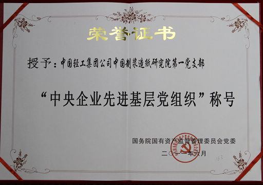 中國輕工集團公司中國制漿造紙研究院第一黨支部七一前夕榮獲國資委“中央企業(yè)先進基層黨組織”榮譽稱號。